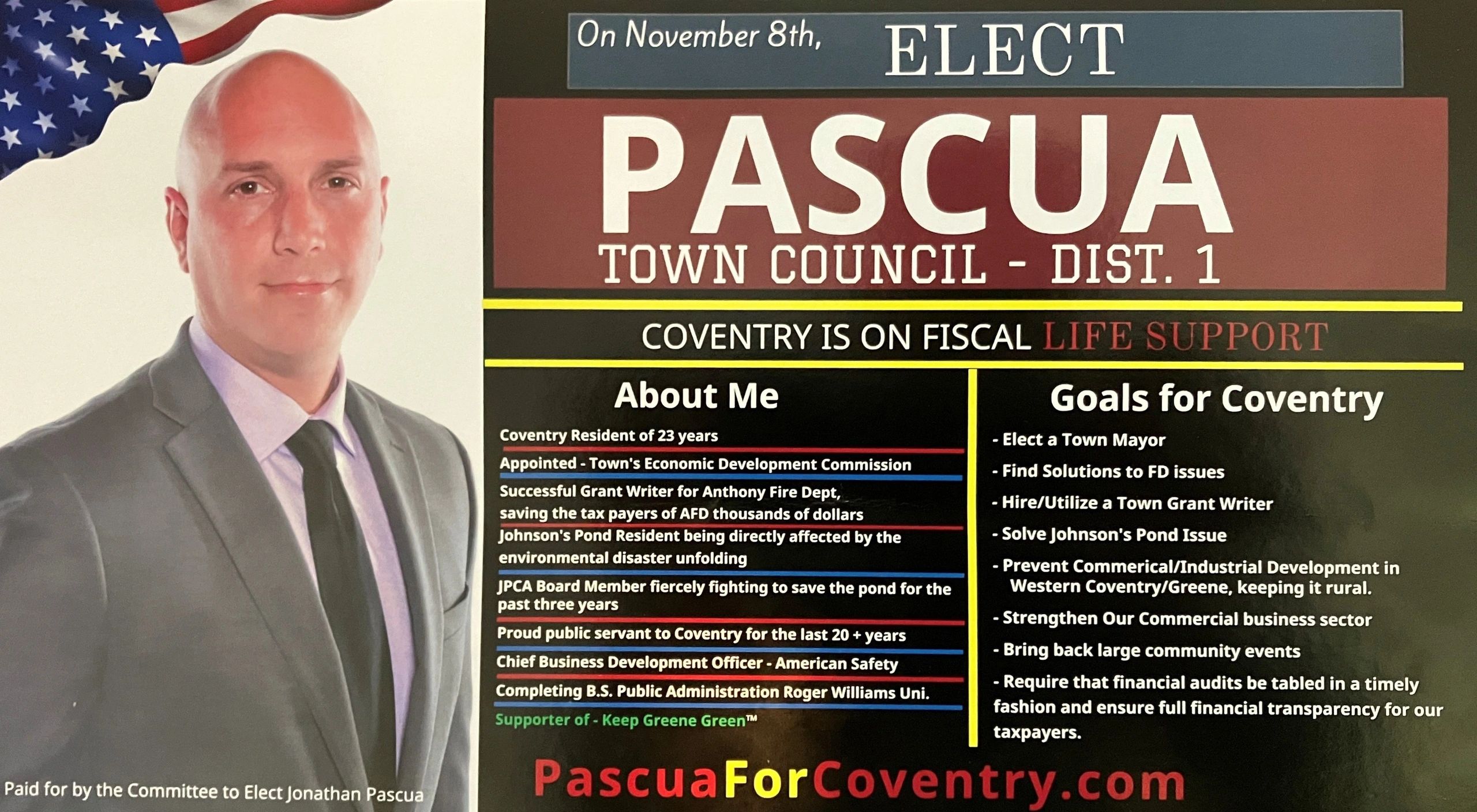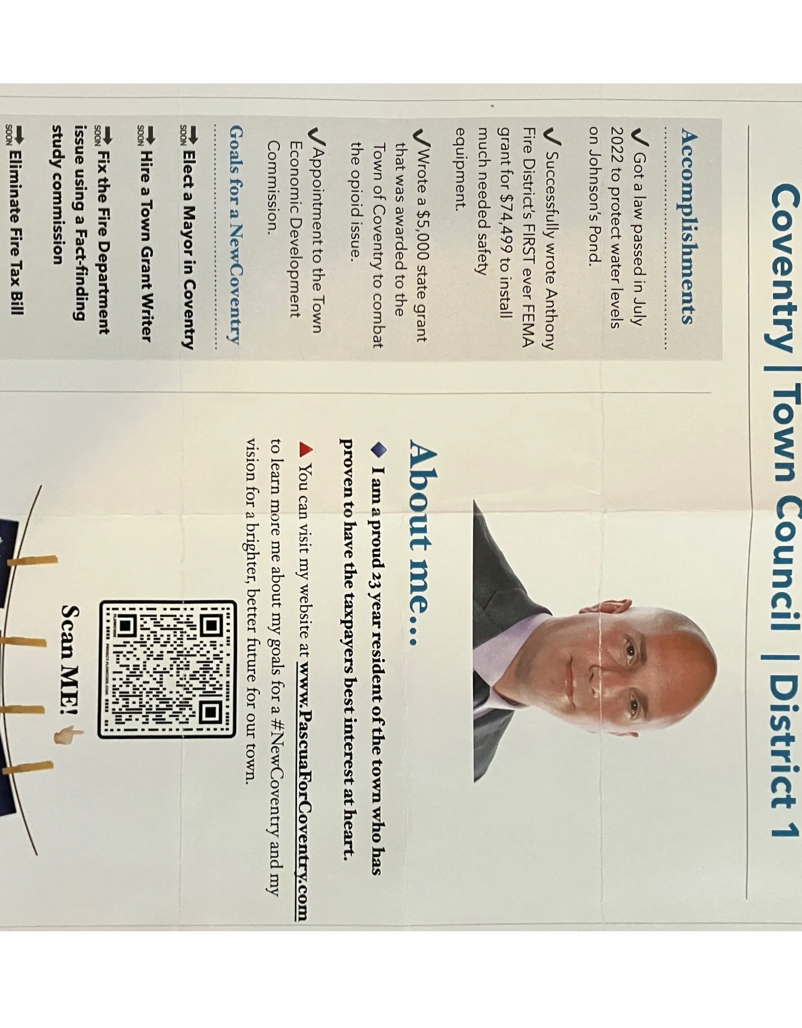 (July flier & Sept. postcard, PascuaForCoventry.com) This is a terrible idea. Presently, our Town Manager is hired based on a nationwide search of individuals who are trained and experienced in managing local government. Our charter specifies certain criteria that must be met in order to be considered for the job. "Town Manager shall hold a master's degree in public administration, business administration or related master's degree from an accredited college or university together with at least five years actual experience as a city, town or county government manager or assistant manager." Town Charter Art. 5.