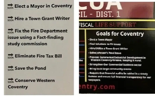 (July flier) This is political word salad. Sounds great, means nothing. Your fire services are not suddenly going to be free. This is really a way of saying, "merge the fire districts into one municipal fire department." I am strongly opposed to this in Western Coventry. As far as I am concerned, the only appropriate comment to any discussion of the Western Coventry Fire District is, "KEEP YOUR HANDS OFF!" As for creating a municipal fire department out of the other three districts, see my CCFD Position Letter found in the Articles page.